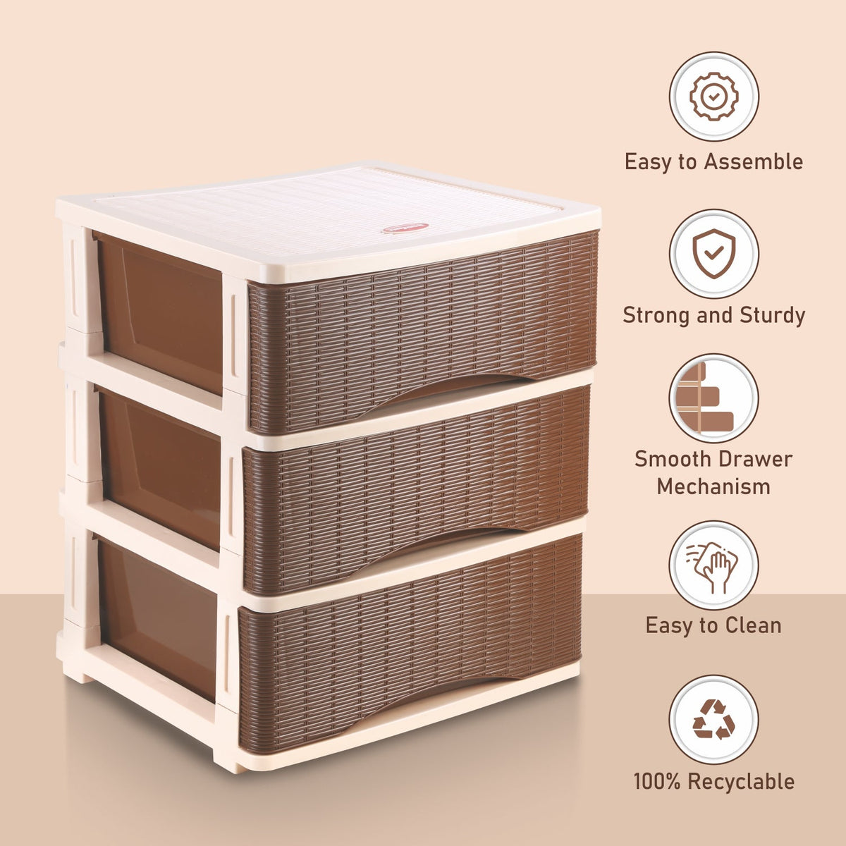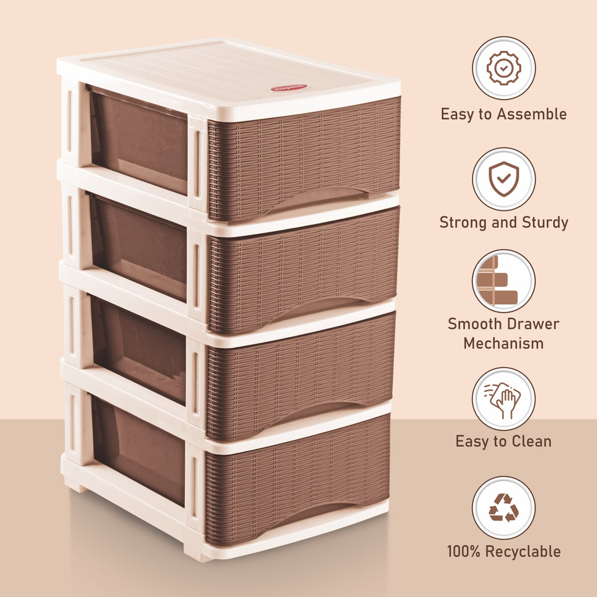 Modular & Easy Assembly: Simple setup with modular components including drawers, top cover, connectors, and base cap.