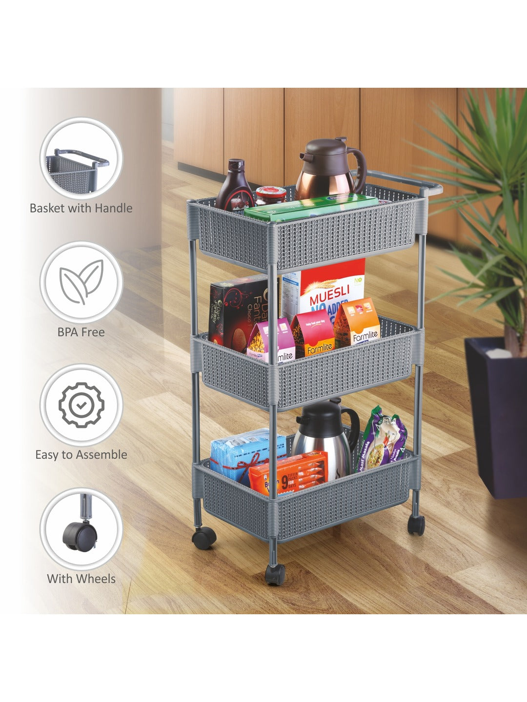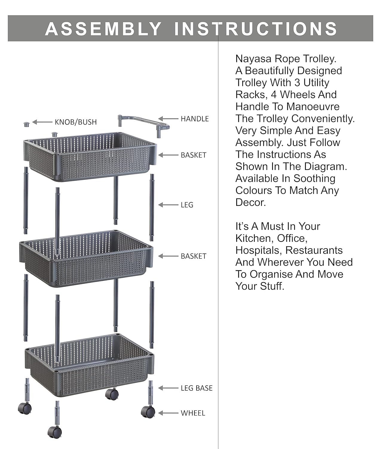 The Nayasa Multipurpose Rope Trolley is a practical and stylish storage solution for every home. Designed with 3 spacious tiered baskets and smooth-rolling wheels, it offers easy access and mobility wherever you need it. Made from high-grade, durable plastic, this trolley is built to last and ensures convenient organization for your daily essentials.