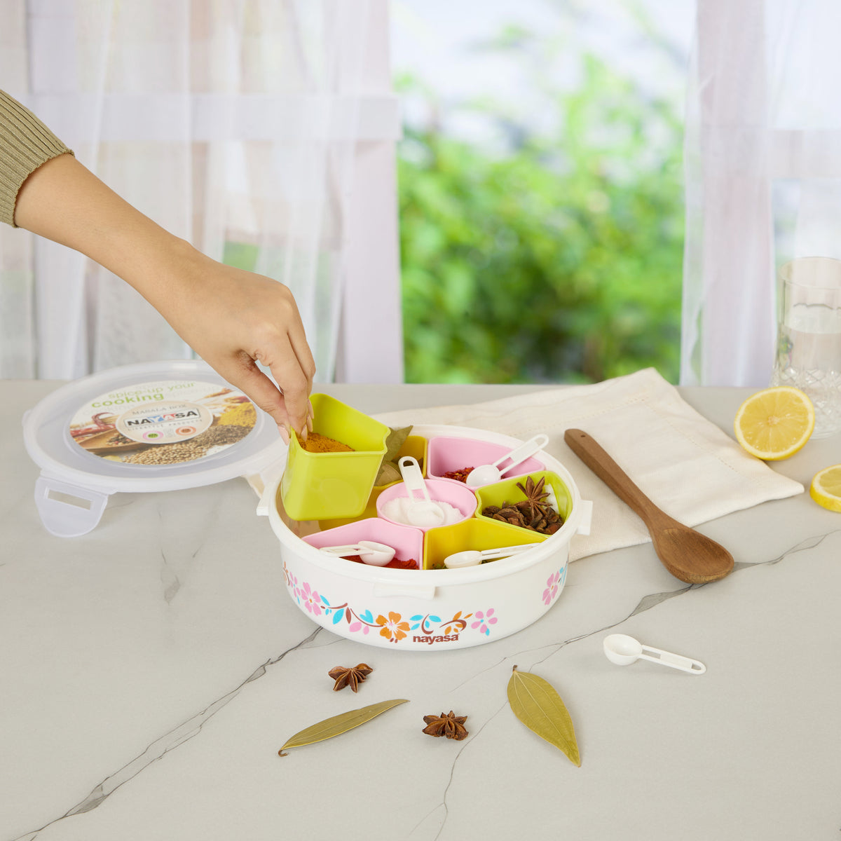 Beautiful printed masala box with 7 sections for organizing spices. Airtight, BPA-free, and perfect for daily kitchen use.