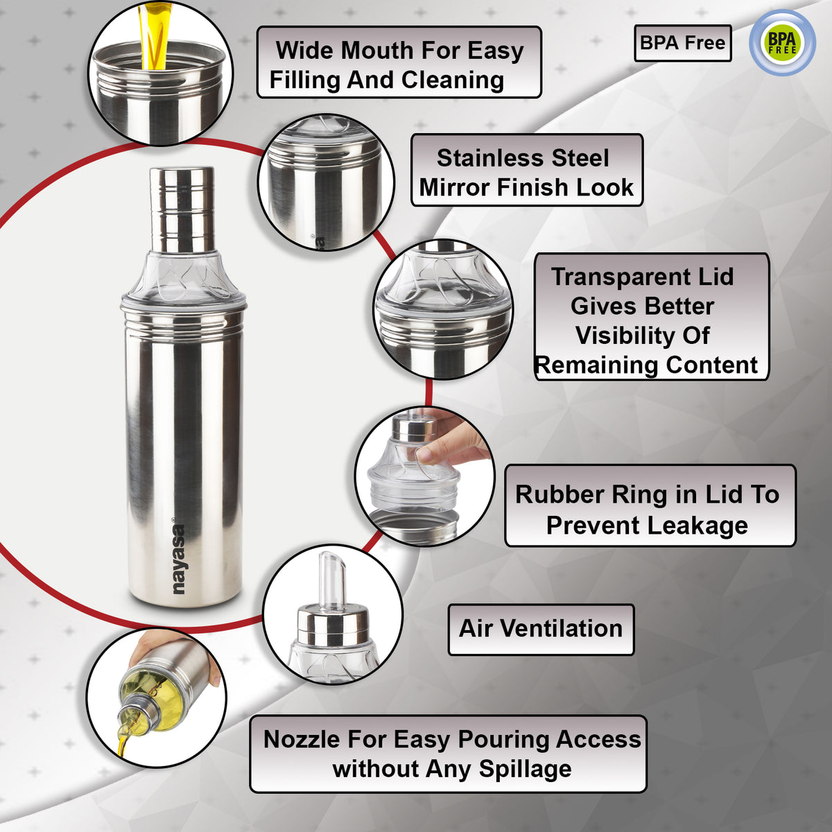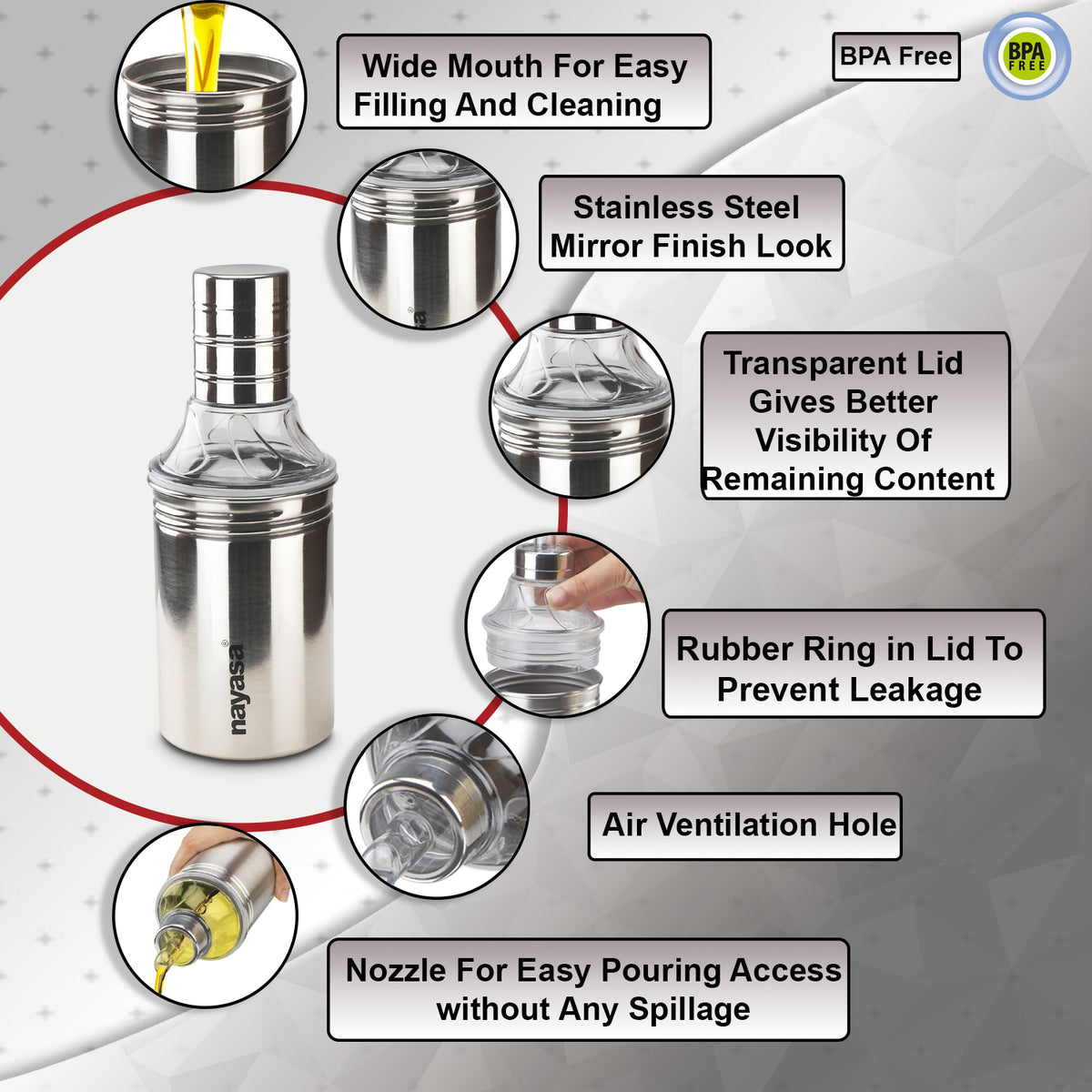 Compact stainless steel oil dispenser designed for smooth pouring without mess. BPA-free, rust-proof, and easy to refill and clean.