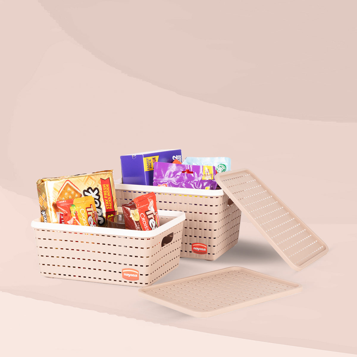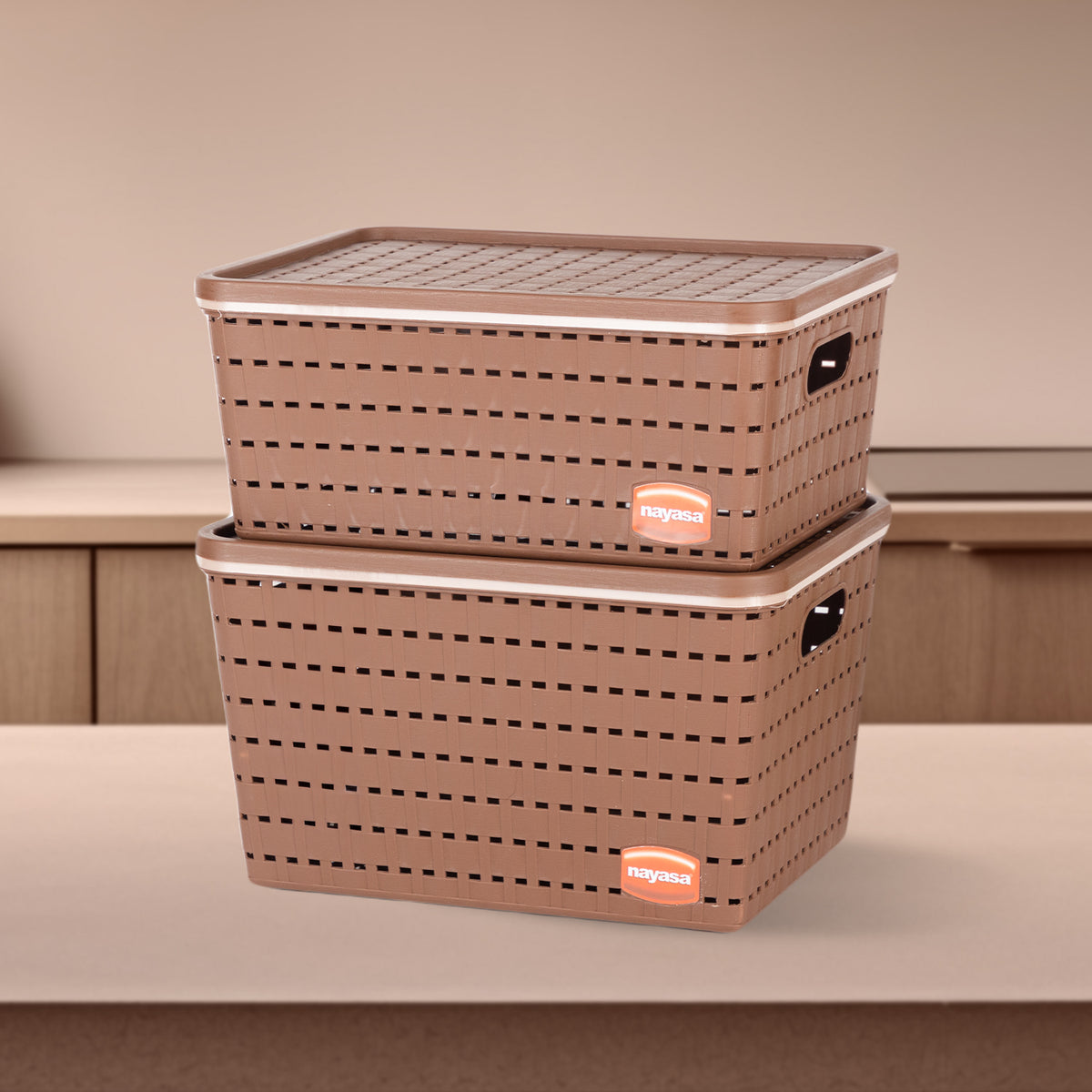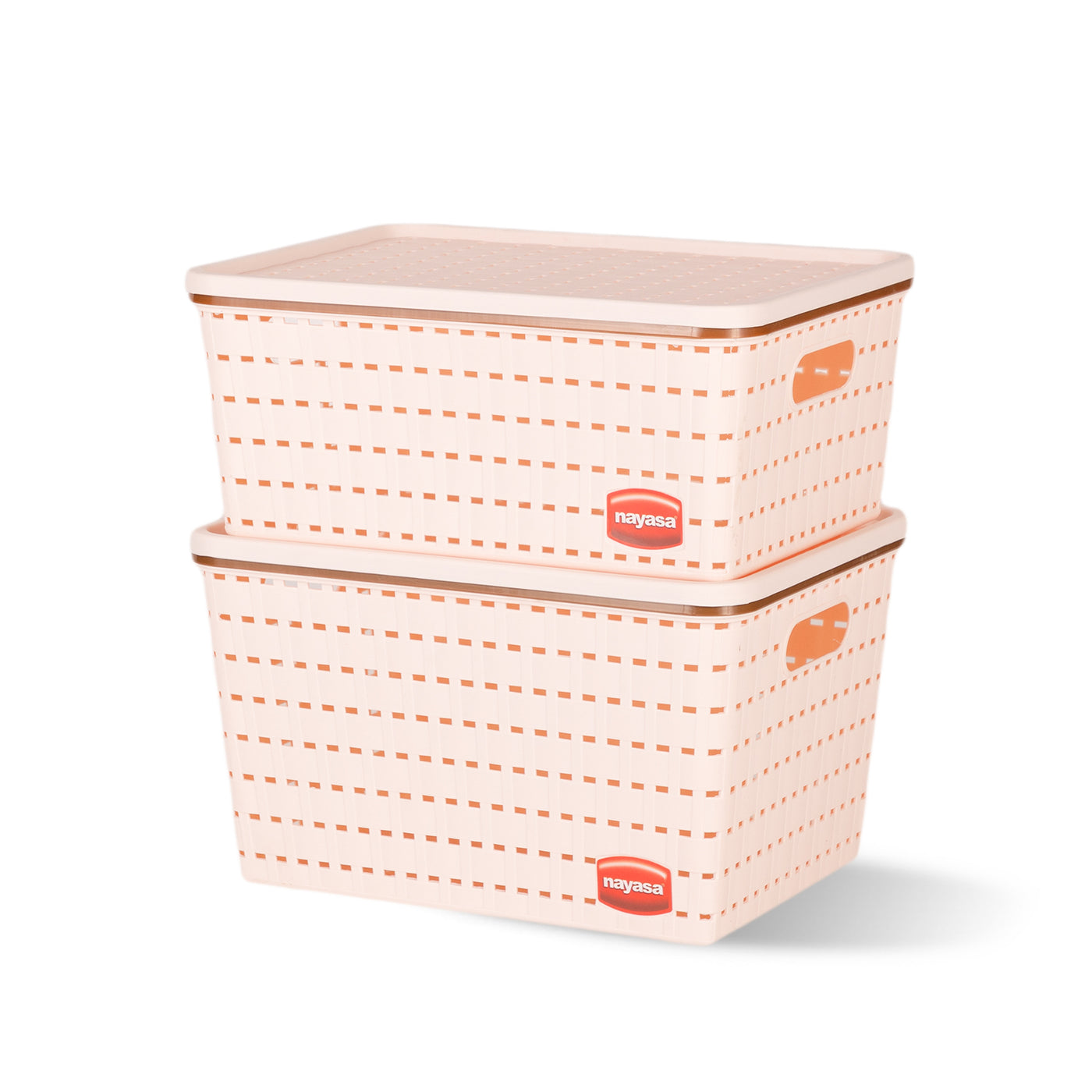 The Nayasa Gloria Basket Set is a durable, multipurpose organizer made from heavy-duty PVC material. Each set includes three baskets with lids, offering ample storage for home or office use. Its net design allows ventilation while side handles make it easy to carry.