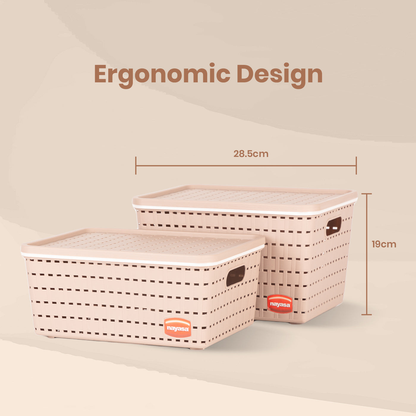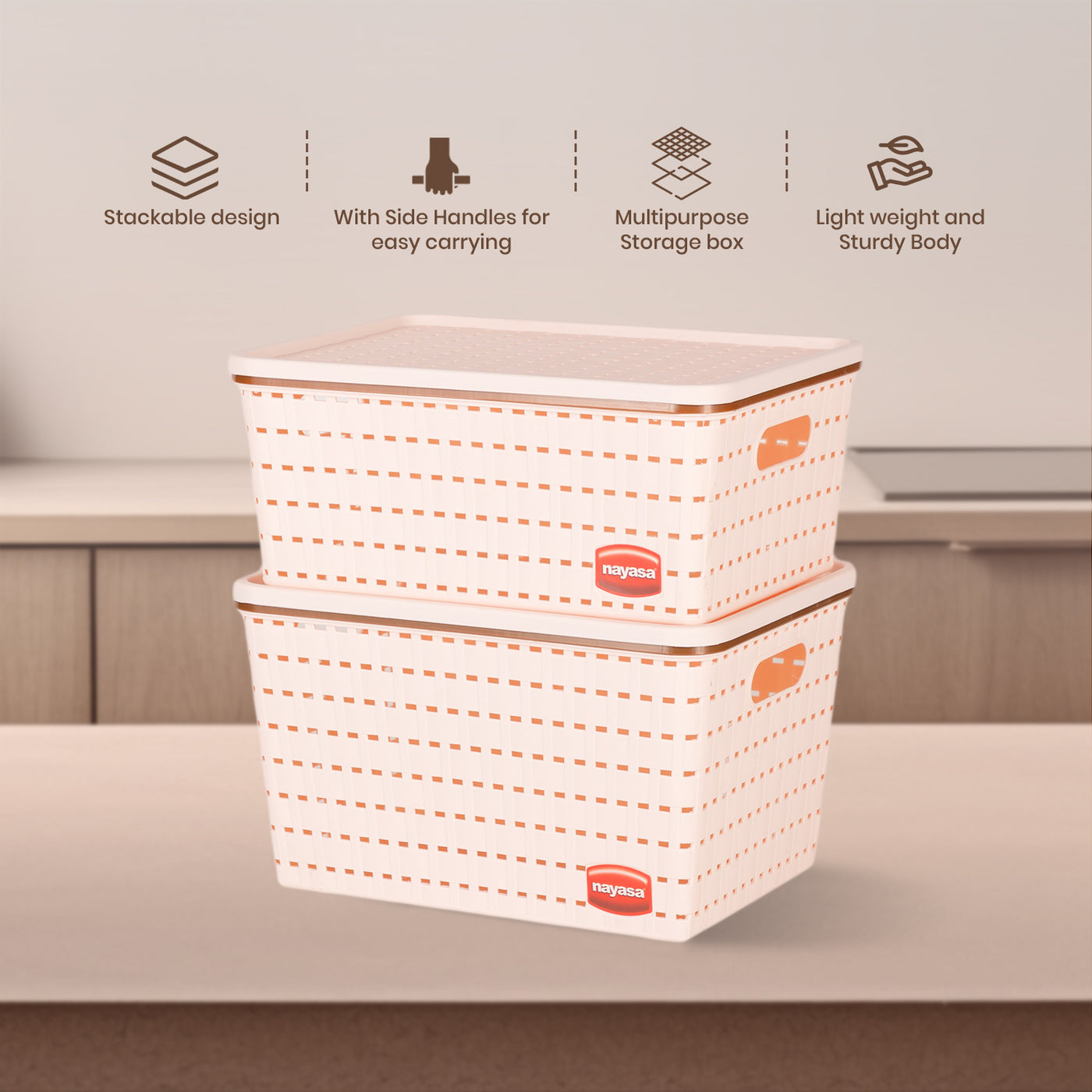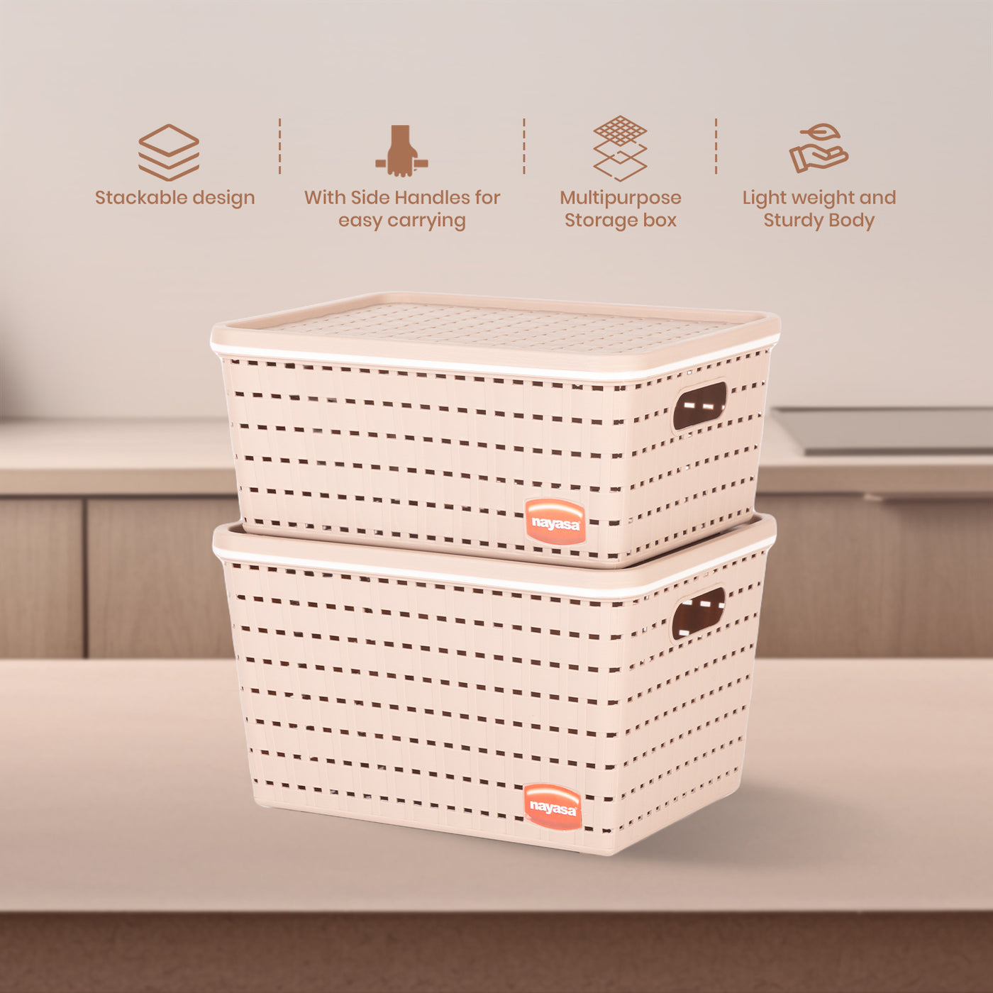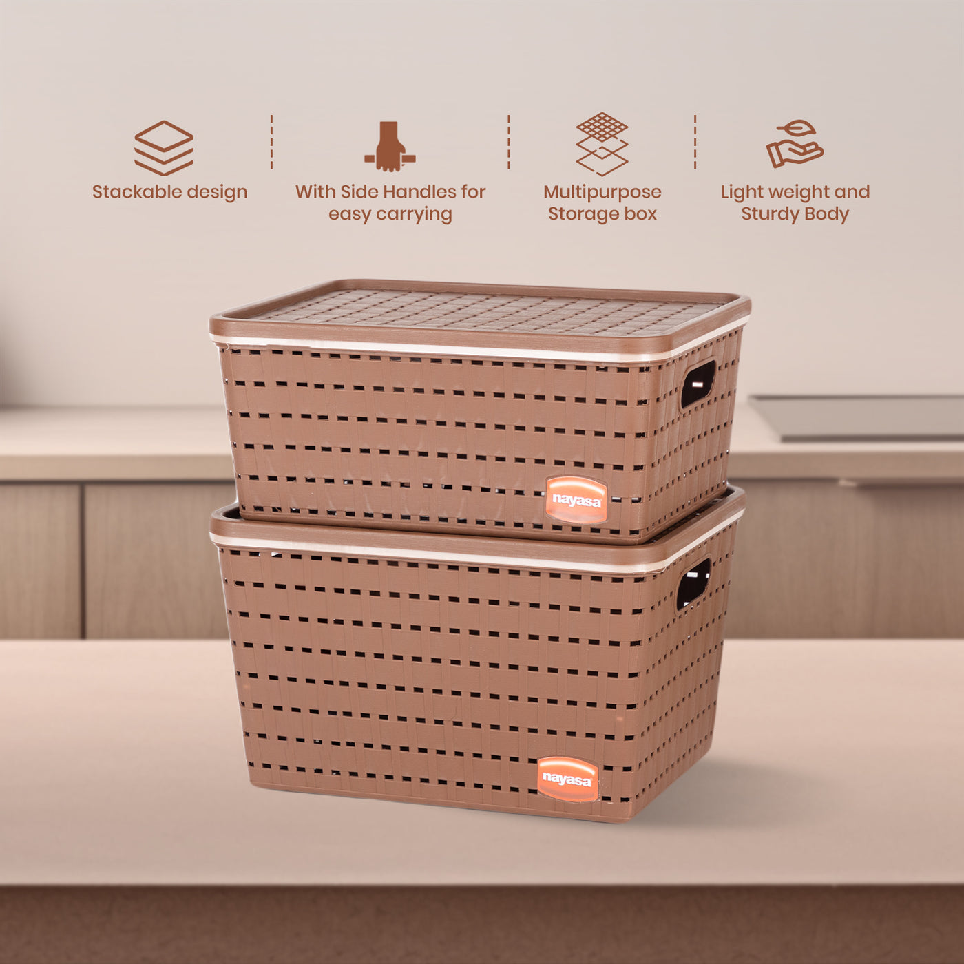 The Nayasa Gloria Basket Set is a durable, multipurpose organizer made from heavy-duty PVC material. Each set includes three baskets with lids, offering ample storage for home or office use. Its net design allows ventilation while side handles make it easy to carry.