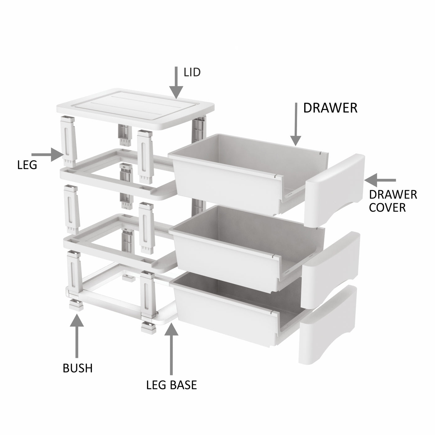 Modular & Easy Assembly: Simple setup with modular components including drawers, top cover, connectors, and base cap.