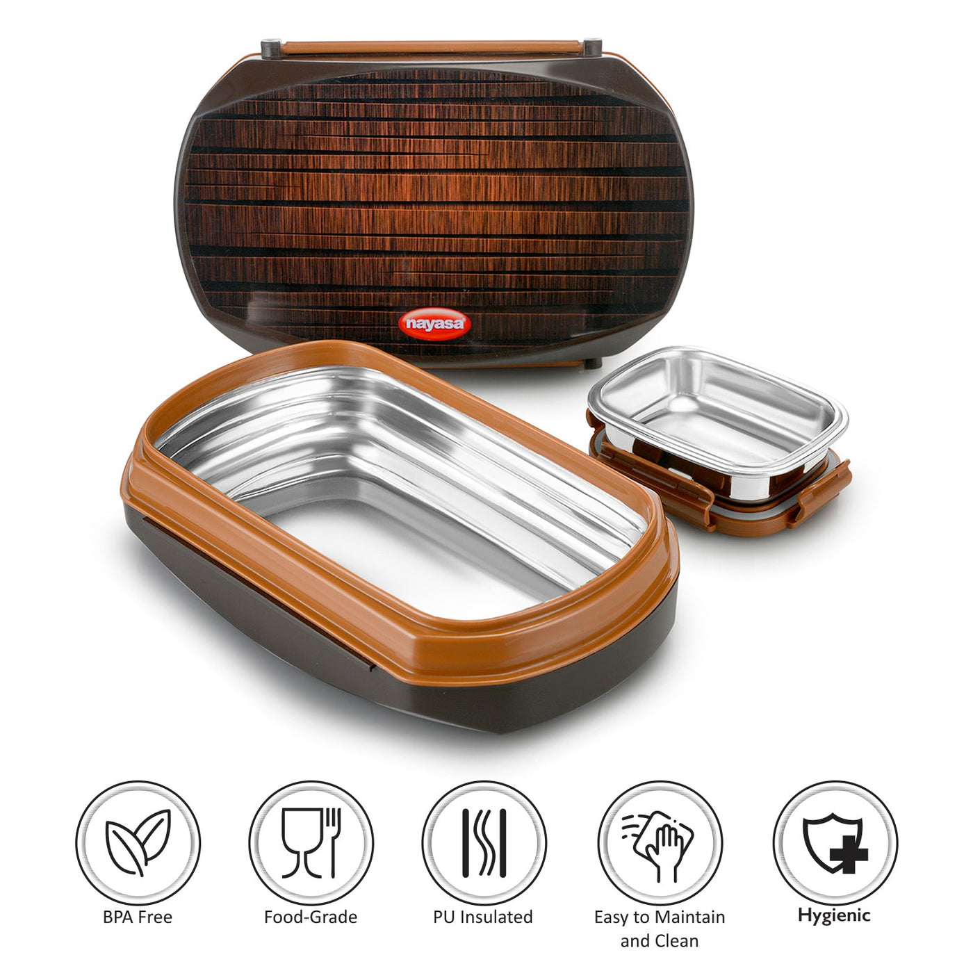 The Nayasa Razor Insulated Lunch Box is designed to keep your meals hot and fresh for hours with its high-quality stainless steel interior. Made from food-grade materials, it is safe, durable, and stylish. Its sleek, compact design fits easily into any bag, while the four-side clip lock prevents leaks and spills. With a separate stainless steel container for dry and wet food, this lunchbox is the perfect companion for school, college, or office.